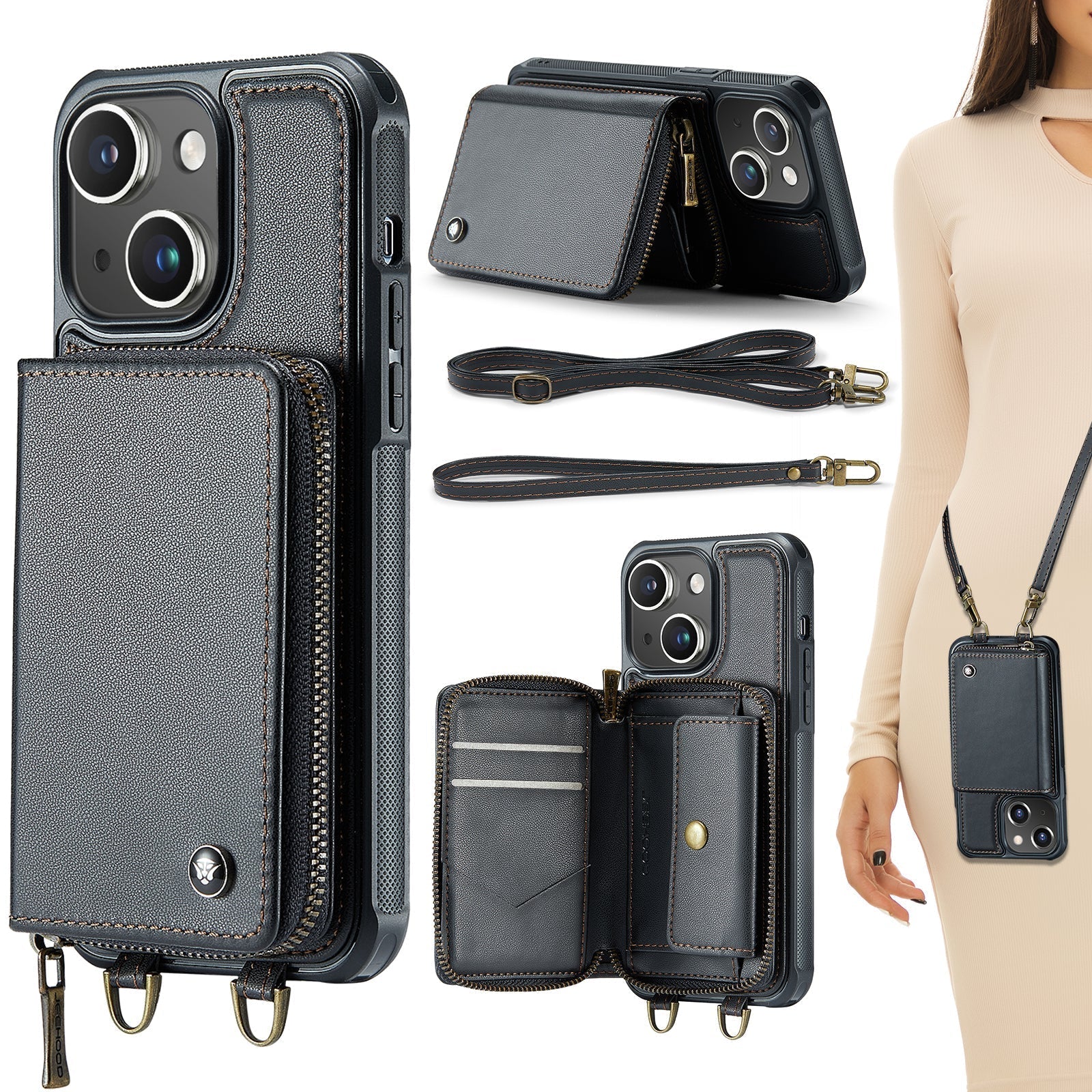 New RFID Blocking Crossbody Zipper Wallet Leather Phone Case for iPhone