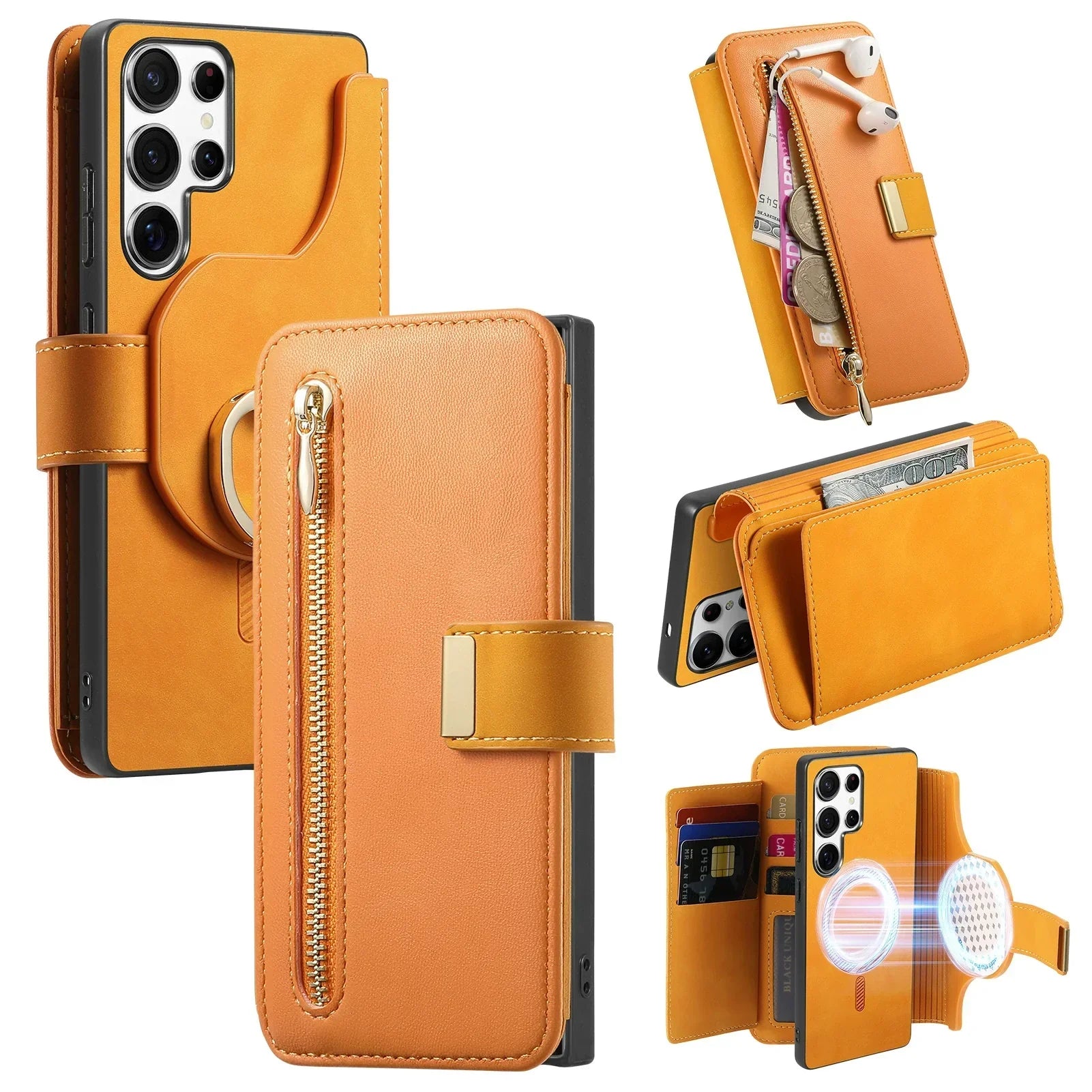 New RFID Blocking Zipper Wallet Magnetic Leather Phone Case for Samsung