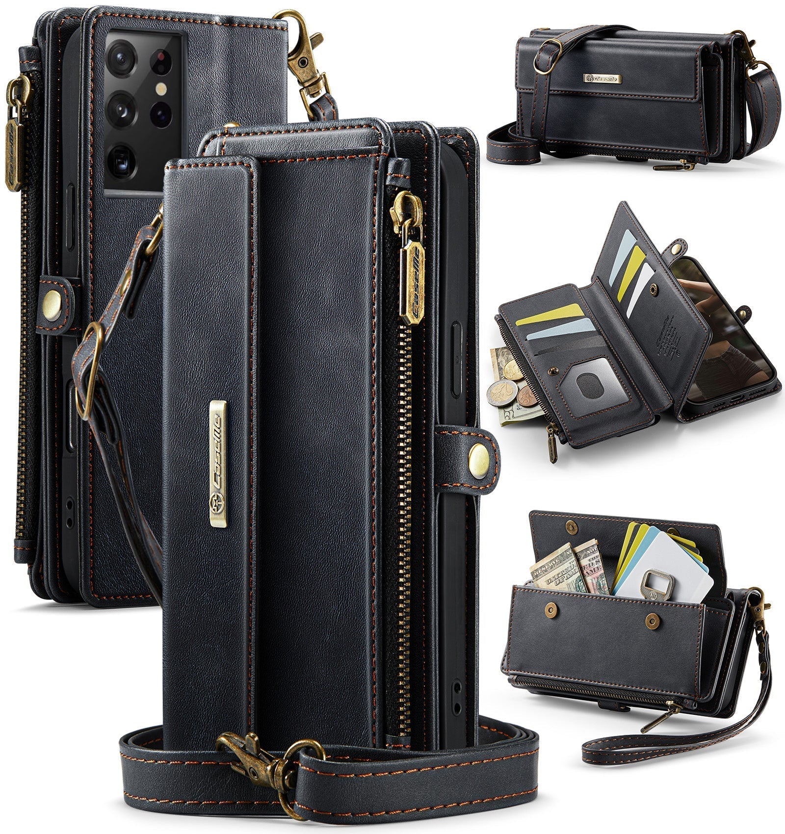New RFID Blocking Zipper Wallet Supports Wireless Charging with Long and Short Lanyard Leather Phone Case for Samsung